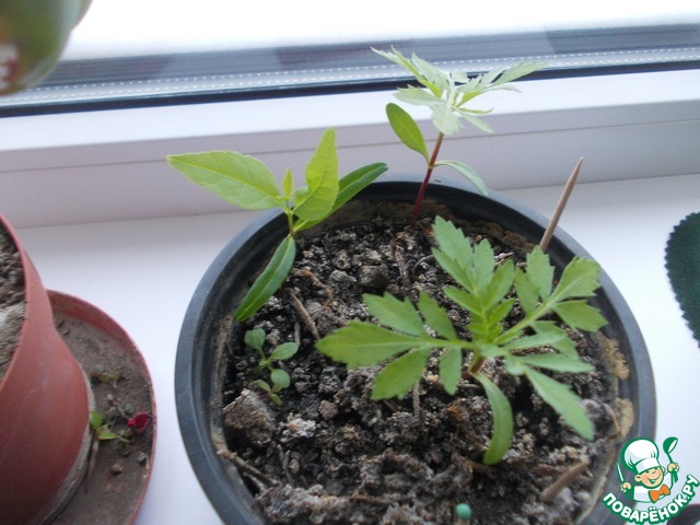 Воодушевленные тем, что прорастили хурму мы посадили косточку мандарина, а вместо нее проросли бархатцы и какой-то сорнячок)))