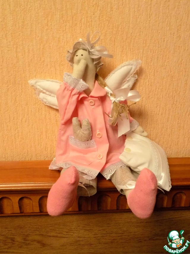 Ангела можно посадить на спинку кровати.