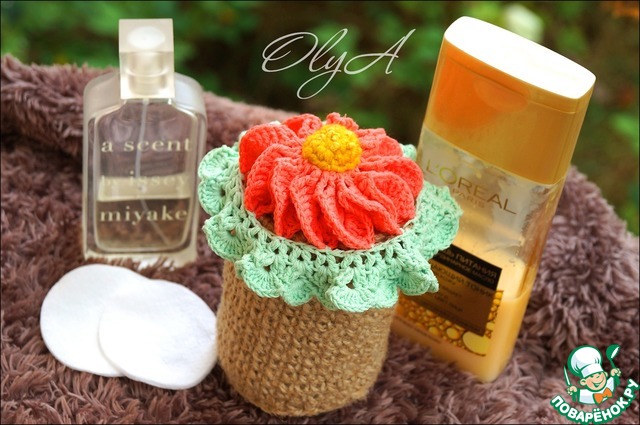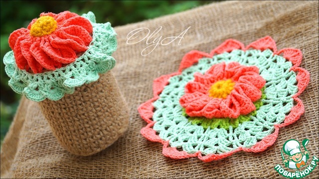Ни то, ни сё получилась салфетка, бог знает как ее использовать, а цветок понравился и я связала еще один. Далее я решила связать декоративную баночку для своих косметических дисков, ну и использовала его в вязке.