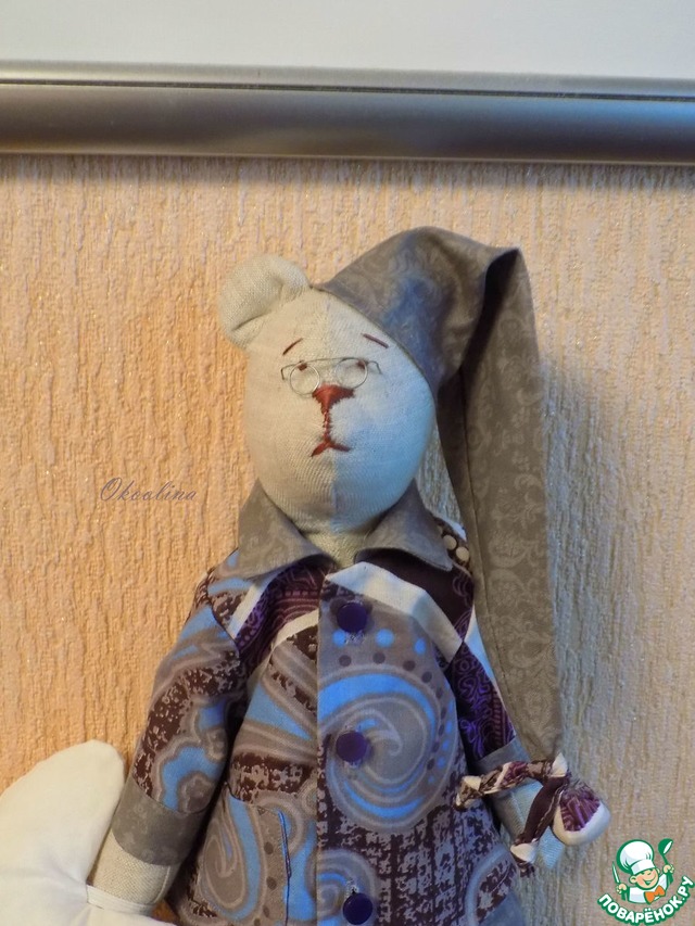 Надела на Михаила очки. Очки тоже сделаны мной из проволоки тонкой.