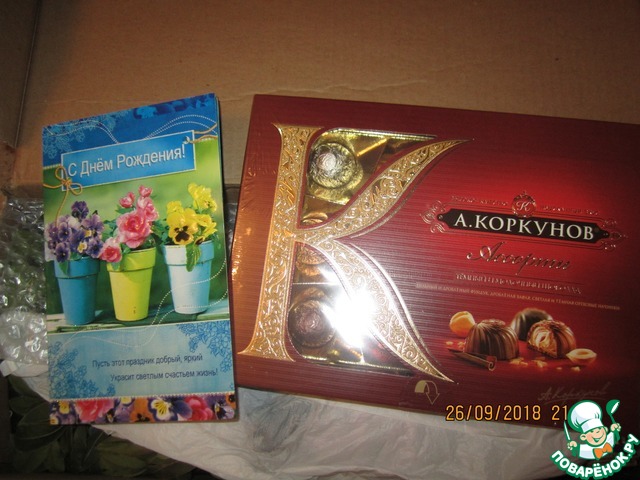 замечательные конфеты и открытка с теплыми и душевными пожеланиями. Спасибо Тома тебе и мужу с сыном, за те слова, которые вы для меня приготовили.