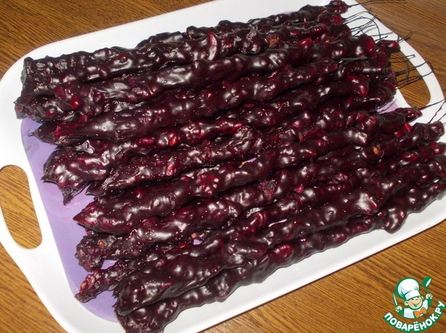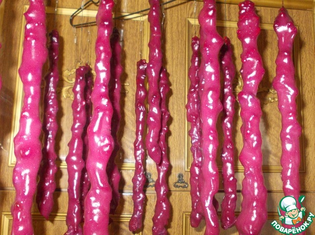 3. А так же каждую осень мы готовим чурчхелу... Делаем из тыквенного сока, яблочного, гранатового и виноградного! Орехи в основном грецкие! В этот раз у меня виноградная чурчхела с грецкими орехами. Для знакомства с этой вкусностью обратите внимание на рецепт поваренка Seagull_L. В зависимости от сорта винограда и его спелости иногда можно добавить сахар. В этот раз у меня так и было... На три литра сока я добавила 2 ст. л. сахара! Время сушки зависит от температуры воздуха и от влажности, а так же лучше сушить на сквозняке. Эта чурчхела сохла у меня в доме на высоте шкафа 5 дней...