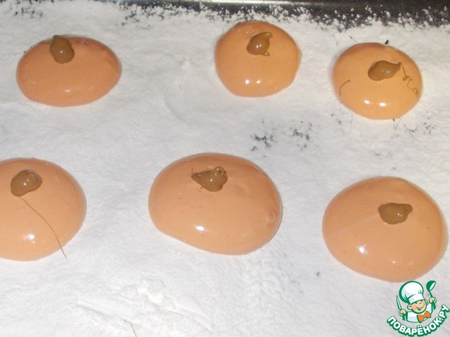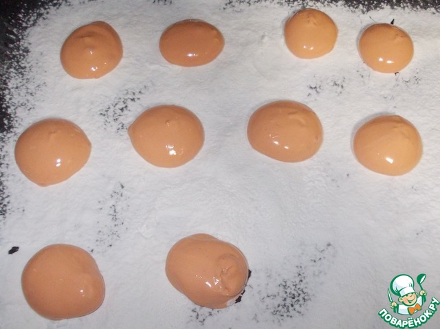 Соорудила я хвостики, но вид конфеток опять не порадовал!! Зато рассмешил еще больше!!! Думала, думала, думала, что же такое сделать, чтоб хоть отдаленно стало похоже на ТО, что задумано... Однозначно не хватает полосочек! Чтоб их сделать я зубочистку макала в воду, затем в крахмал и проводила ею от края лепешки вверх в сторону хвостика