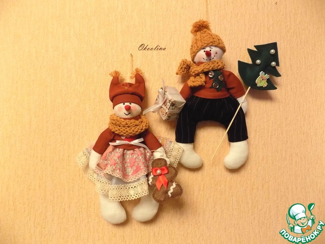 Парочка снеговиков. Мальчик и девочка. Рост-30 см. Очаровательные создания! Шапка, шарф, снуд связаны вручную. Куклы из хлопка 100%, льна. Одежа частично из трикотажа. Куклы настенные, их можно посадить.