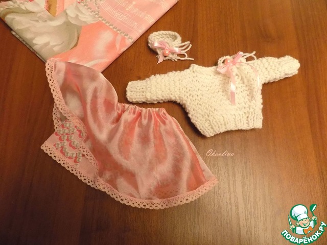 Вот такую одежду я ей приготовила. Свитшот и ободок вязаные, двойная юбка с кружевом.