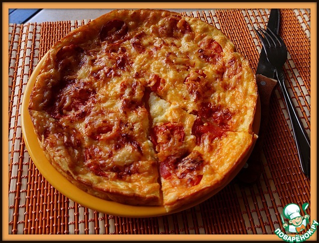 Кабачковая пицца от Тани hto33.Срочно нужно было использовать кабачок,пока он совсем не стал дубовым.Получилось очень даже ничего,мне понравилось.Моя семья,не найдя в пицце колбасы,есть отказалась,да и ладно,я угощалась с удовольствием!