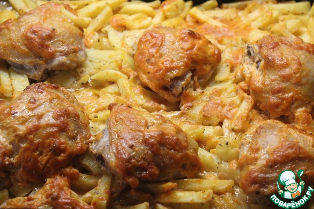 А вкусно получилось. И много! Готовила все точно по рецепту, но увеличив количество продуктов. Вместо голени брала бедра. Делать проще простого, а результат очень порадовал. Большой противень почти весь съели вчетвером. Некоторые поварята писали в комментариях, что сухо получилось. Не надо жалеть соуса, тогда все приготовится сочно и за 40 минут.
