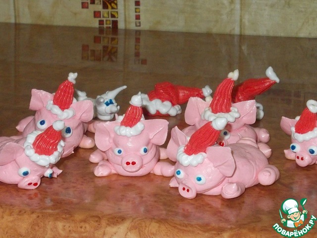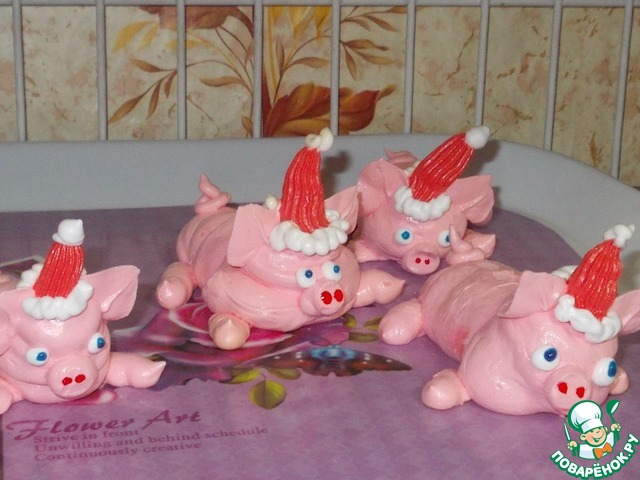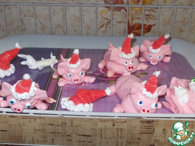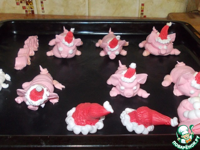 Если Вы видели мой предыдущий пост об этих смешных хрюшках, то можете заметить какие изменения я внесла в этой партии! Правильно!!! У них появились шапочки, как у деда Мороза!!! А еще глазки я сделала капельками белого безе, что делает мордашки еще более потешными!