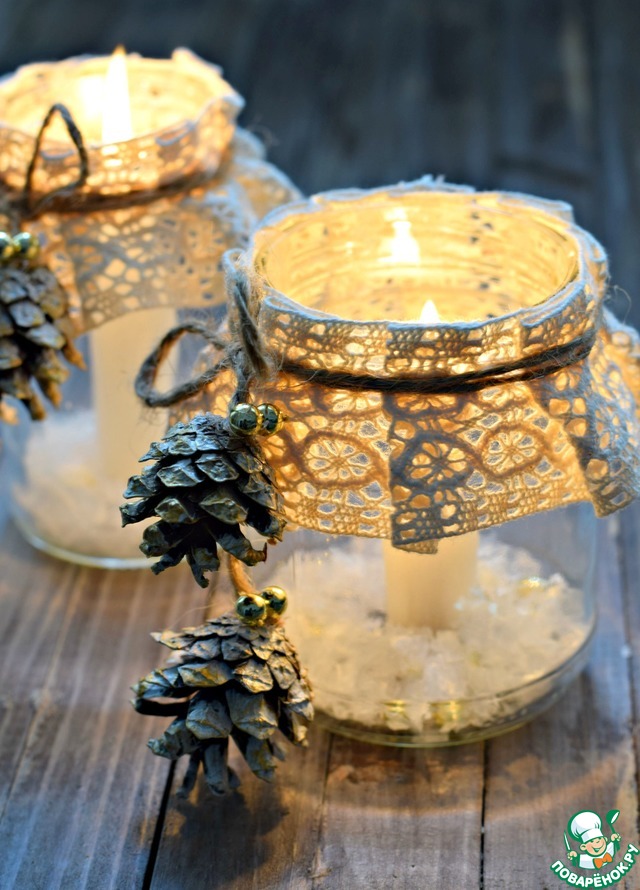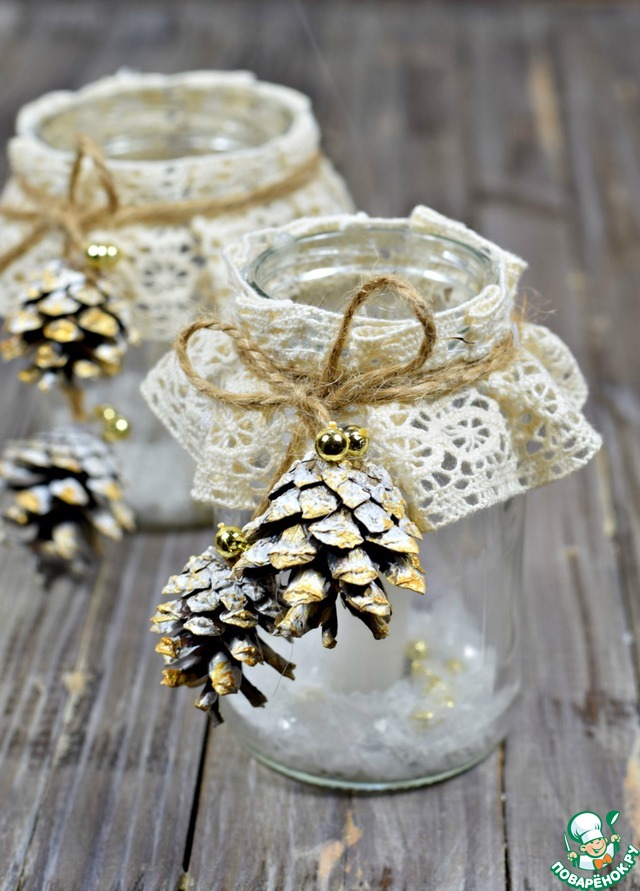 Нам понадобится небольшая стеклянная банка, широкая тесьма, пара маленьких шишек, джутовая веревка и несколько бусин. Тесьму приклеить по горлышку банки, перевязать веревкой или лентой. К концам веревки приклеить маленькие шишки, покрашенные белой и золотой краской. В банку насыпать немного искусственного снега, несколько ярких бусин и поставить в банку свечку.
