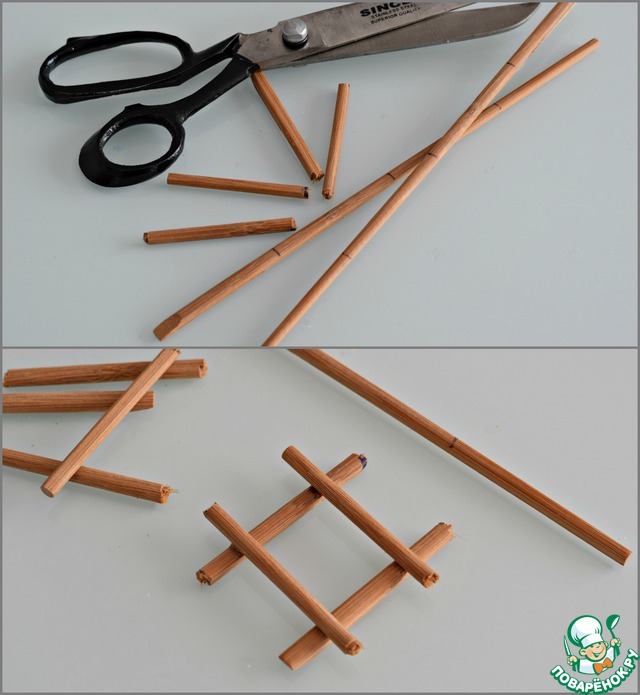 Чтобы шишка была устойчива и не валилась на бок, поставим ее на подставку. Возьмем палочку для суши или толстенькую деревянную шпажку, разрежем ее на четыре равные части и склеим эти части между собой в виде квадрата.