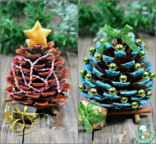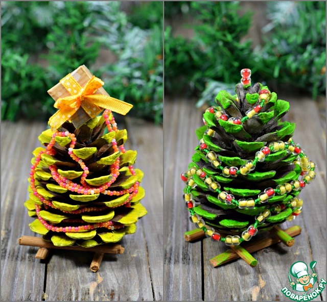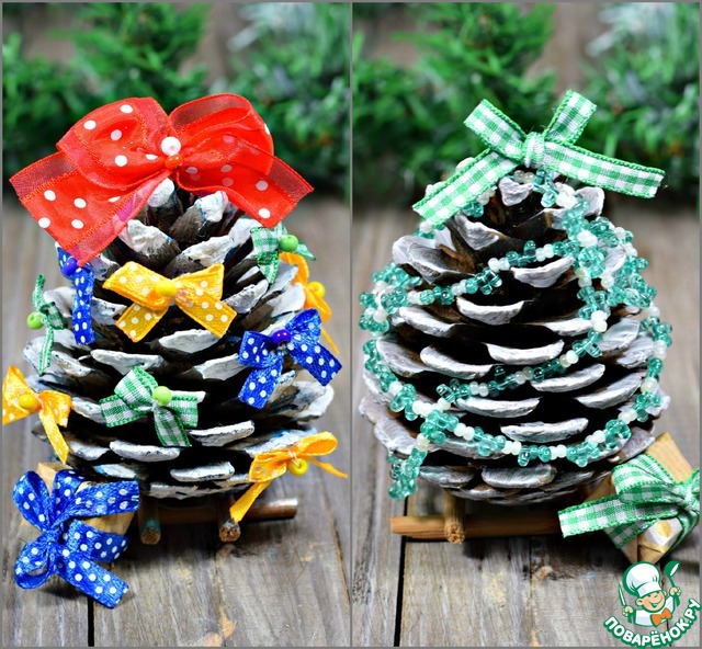 Шишку покрасить, приклеить яркую тесьму (на которой шишка будет висеть на ветке) и декорировать бусинами.