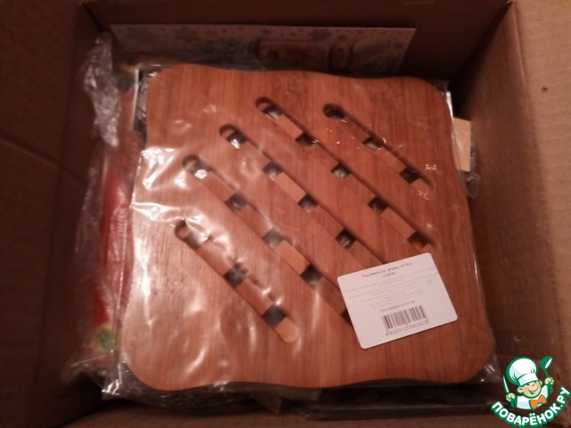 бамбуковая подставка под горячее, очень нужная в хозяйстве, мои совсем износились, все присматривала себе, а тут - вуаля - Дед Морозик постарался. Старшему сыну очень понравилась подставка, все ходит ее рассматривает.