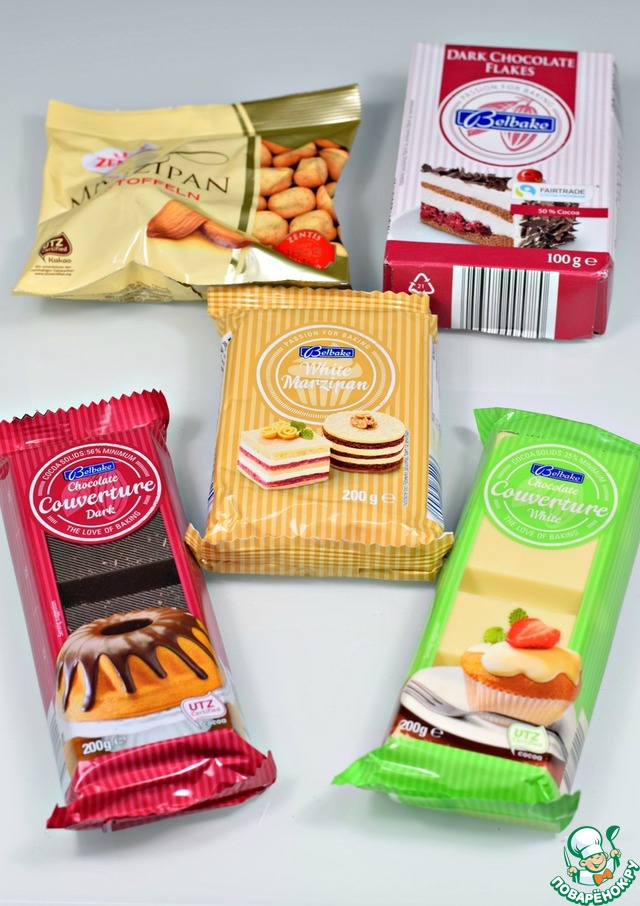 Имея в руках такие кондитерские штучки, хочется забыть про всякие диеты и постоянно печь что-нибудь вкусненькое. Тут и белый марципан, и марципан (о, чудо!) картофельный, шоколадная стружка для тортов-пирожных, белый и темный шоколад для приготовления глазури.