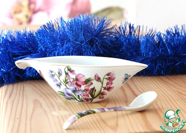 Яркая новогодняя гирлянда и невероятно миленькая и нежная соусница с ложечкой. Правда на ней написано, что это форма для подачи икры, но думаю такую форму можно заполнить только икрой заморской. Я её приспособлю под соусницу.