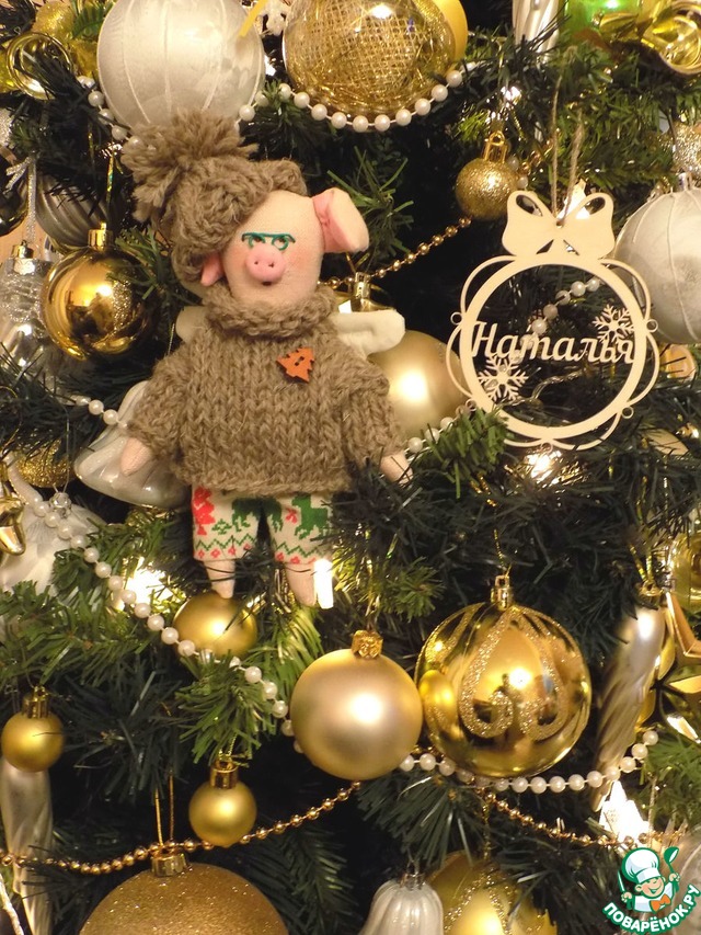 Хрюню себе сшила и тоже обвязала. У него очаровательный шерстяной свитерок и беретик. Это Хрюн Сашка. С денежкой на шее. В десяти рублях мне просверлили дырку и я вздела в неё шнурок и повесила Хрюну на шею, чтобы был достаток в доме! Хрюн у меня как и положено тильдам-ангелочкам с крылышками, ростом 16 см, он в очках, как и Сашка, пока висит на ёлке.