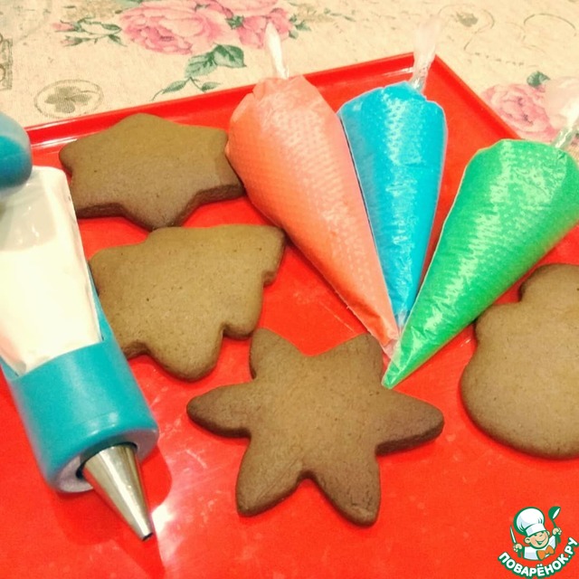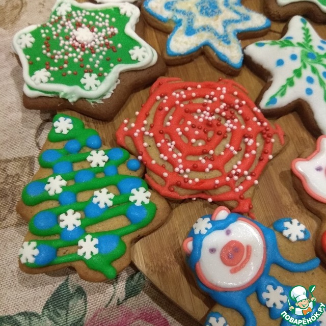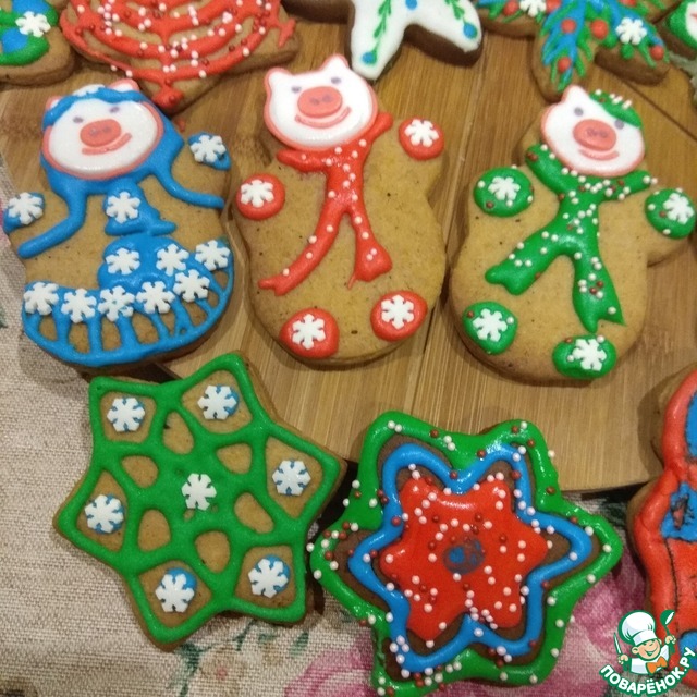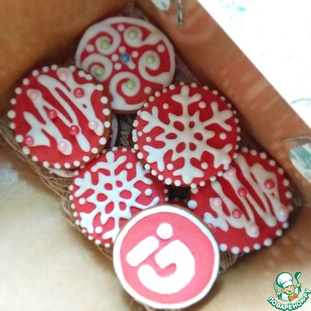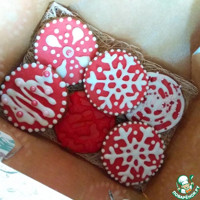 Не скажу, что все получалось удачно. Имхо, первая глазурь, даже разбавленная по инструкции водой, оказалась местами густовата. Пакеты - великоваты. Руки - кривоваты. Но на четвертой печенюшке стало заметно проще, а под конец я даже приноровилась регулировать толщину линий и скрафтила для мужа "на глазок" спартаковскую ёлочку, которая была мгновенно уничтожена "на удачу в новом сезоне". В общем, как-то так выглядит мой первый прянично-глазурный опыт. Часть печений расписаны 12-летней племянницей мужа. Способная девочка!