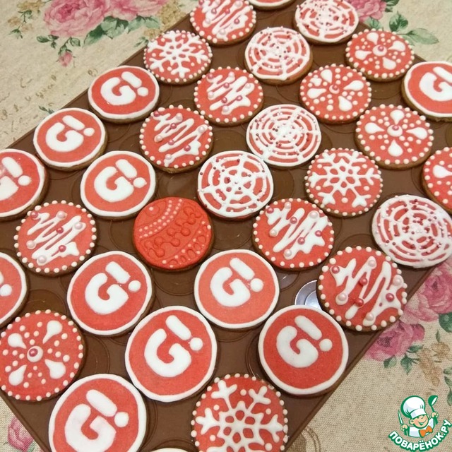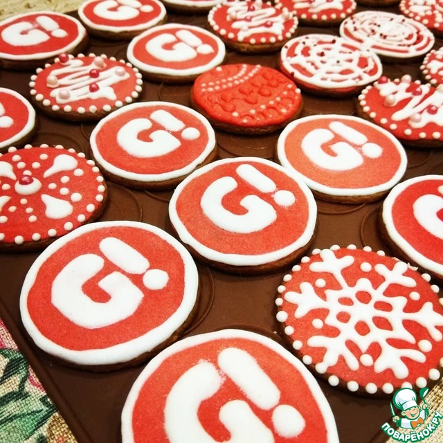 Следующие 2 ночи ушли на расписывание печенюшек. Я решила, что учиться нужно на простых формах и простых узорах. И использовать для начала 2 цвета. Наш корпоративный логотип идеально подошел, поэтому его и выбрала. Двойная польза: мне - тренировка, коллегам - приятный сюрприз в виде "корпоративных" печенюшек.