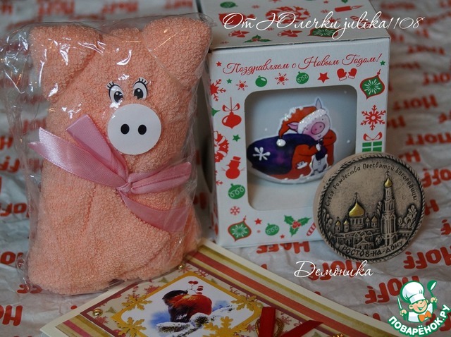 Сказочная открыточка ручной работы с милым поздравлением от Юлечки, розовое нежное полотенечко, свернутое в виде символа года - свинки и ручной работы шарик на елку, тоже с символом года. И очень красивый глиняный магнитик из Ростова-на-Дону, откуда приехала посылка.