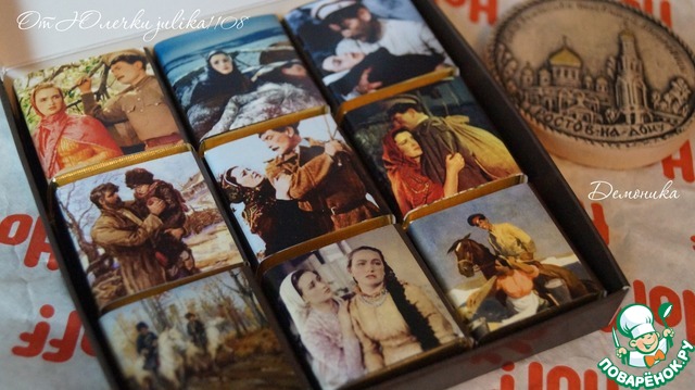 О конфетах отдельно! Это невероятный набор! Фирменный, ростовский! И название соответствующее - "Тихий Дон". На каждой конфете - кадр из фильма и крылатое выражение из него. Признаюсь, мне как филологу по образованию было жалко их есть, но мы с этим справились)