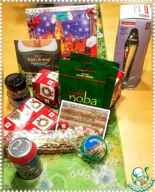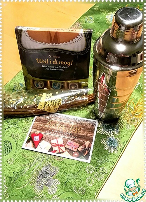 А тут, девочки-мальчики, для души. Даже и не знаю, с чего начать. Открытка с теплыми пожеланиями от Нины и Насти, добром и теплотой веет от них, так приятно. Шоколадные конфеты с баварской тематикой, красивые такие, с эдельвейсами. Шейкер для коктейлей, приведший в восторг моего мужа, такой классный, прелесть!