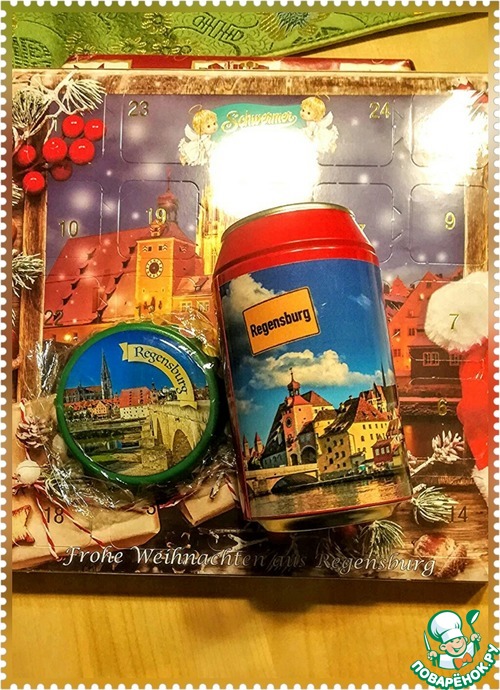 Тут всё с символикой Регенсбурга, города, где живет мой Морозик. Календарь Адвента с миниатюрными и безумно вкусными конфетами, 4 мы с дочкой уже оприходовали. Открывашка-магнитик, которой очень обрадовался муж и тут же водрузил на холодильник. И пазл из 120 деталей с видом Регенсбурга, которому очень обрадовалась моя дочка - как же было приятно, что и про нее Морозик не забыл!