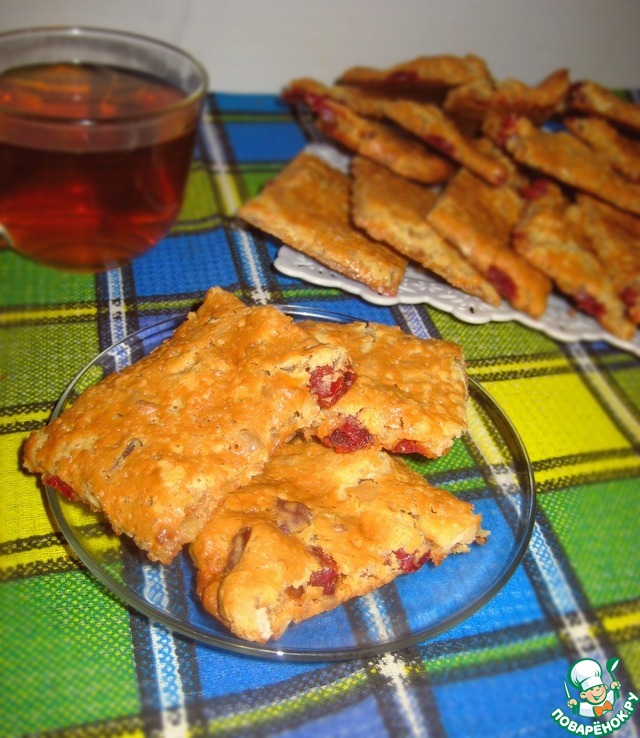 Печенье "Дуэт" https://www.povarenok.ru/recipes/show/155833/ по рецепту Насти Анастасия АГ! Не смогла пройти мимо такого интересного рецепта! Сгущенки и крахмала положила чётко по рецепту, добавила вяленую вишню и грецкие орехи. В процессе выпечки тесто разошлось практически по всей поверхности противня (видимо все-таки моё тесто получилось не таким густым как в рецепте из-за разности сгущенки, я думаю) и верх стал пористым. Время выпечки у меня получилось где-то минут 20 и печенье стало хорошо румяным. Горячий пласт нарезался без проблем. Печенье на вкус как сгущенка))) может потому что я знала, что она там есть! Интересненькое получилось печенье, хрустящее, ароматное и с наполнителями можно варьировать! В общем, нам понравилось!