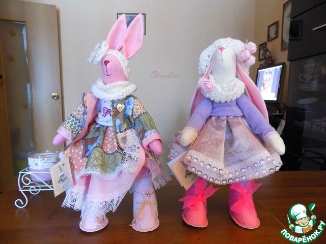 Зайцы и их одежда изготовлена из натуральных материалов: лён и хлопок, трикотаж х/б. Ботинки из фетра. Берет, ободок и снуды вязаны на спицах вручную. Одежда полностью снимается, кроме свитерков.