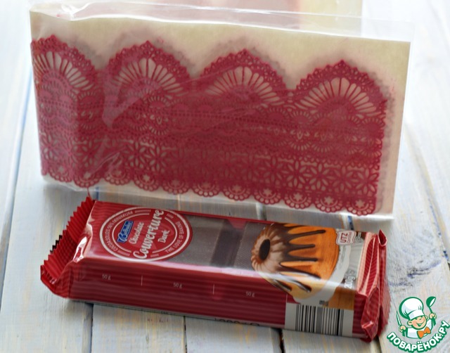 Для моих кулинарных изысканий съедобное кружево потрясающего вишневого цвета и шоколад для приготовления глазури или украшений для выпечки и десертов.