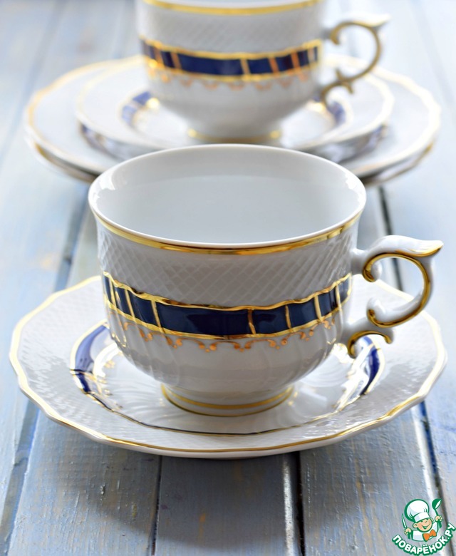 А это...Это гвоздь программы! Бесподобные чайные пары и к ним две десертные тарелки в моей любимой цветовой гамме: синее, белое, золотое. Ну красота нереальная! Шик! Блеск!