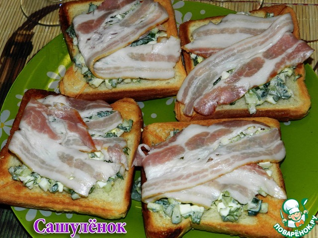 Готовил Макс к приходу гостей)) Отличные бутерброды получились! Решили использовать бекон и сметану.