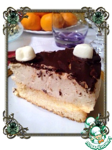 Корж получился вкусный,с хорошей кислинкой.Верхушка была сливочно-кофейная,покрыт торт глазурью из тёмного шоколада.Украшен мини-зефирками