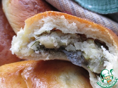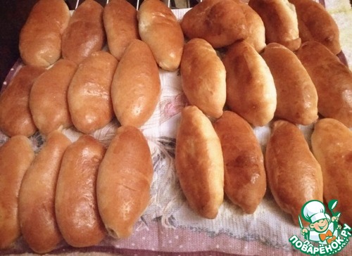 Делала двойную порцию,на 1 кг муки.Получилось 24 пирожка,размером с ладонь.Много начинки в каждом.Начинила картошкой с лесными грибами и рисом с варёным яйцом