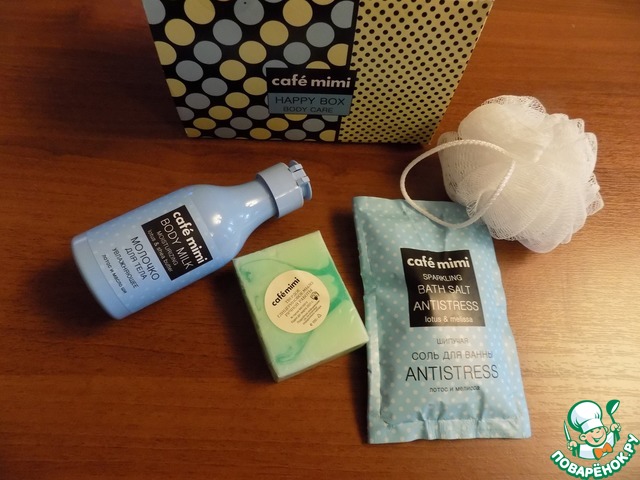 Набор для ванны: мыло натуральное, соль для ванны, молочко для тела и мочалочка.