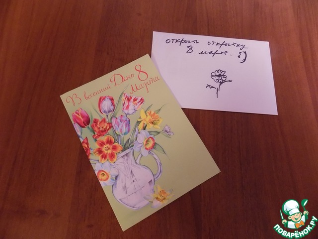 Поздравительные открытка и конверт, который велено открыть 8 Марта! Ира, честно-честно не открыла сегодня, буду ждать 8 Марта!