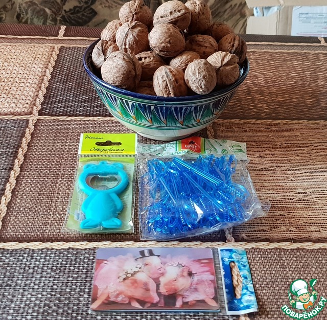 Прикольный магнитик с поросятами, необычная открывашка, шпажки и куча грецких орехов.