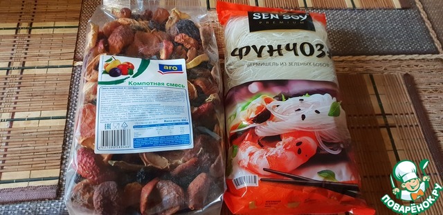 Компотная смесь из сухофруктов и большая пачка фунчозы.