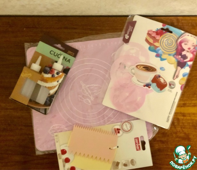 Коврик для раскатки теста с разметкой. Очень удобный и красивый. Шпатели для работы с кремом при украшении тортов, трафареты для украшения кофе и выпечки, кондитерские бутылочки для украшения кремом и выведения рисунков. Все выдержано в одной цветовой гамме.