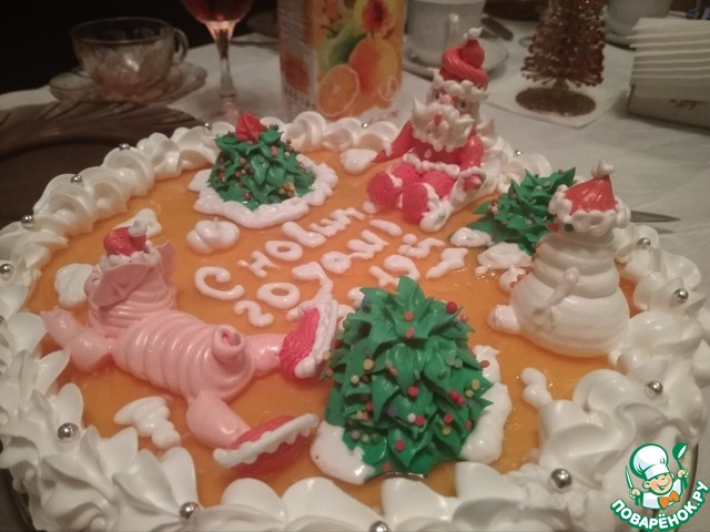 2.Тортик сборный. Коржи испекла по рецепту "Торт "Чародейка" от поваренка Светланка g980 , а крем "Заварной сметанный крем" по рецепту поваренка Танюши-mtata . Пропитка у меня апельсиновое желе, верх так же апельсиновое желе и украшения из "швейцарского безе" по рецепту, который публиковала я сама. Бисквит пекла в форме диаметром 26 см пропорции не увеличивая. Высоты хватило на три коржа! Крема делала двойную норму. Очень понравился сочетание!