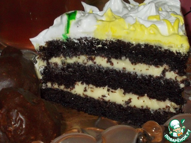 5.Следующий сборный торт состоит из бисквита по рецепту "Торт"Шоколад на кипятке" от поваренка Ksuscha и крема по рецепту "Крем по-бразильски на сгущенке и лимонах" от поваренка molohovez. Корж пекла в форме 26 см диаметром. Крема делала двойную норму и еще в крем добавила цедру. Кстати, в крем использовала сливки приготовленные из молока и масла по рецепту "Домашние сливки" от поваренка yanabeen. Сливки такие делаю теперь часто!
