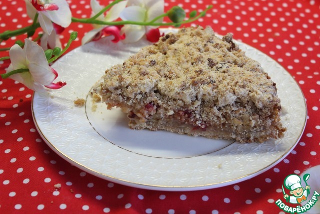 Наконец-то я воспользовалась рецептом. Все продукты оказались в наличии. Очень вкусный рассыпчатый пирог. Добавление брусники дает свою изюминку. В следующий раз добавлю побольше брусники. Пекла 40 минут при 180 градусах в разъемной форме диаметров 26 см. Остужала в форме.