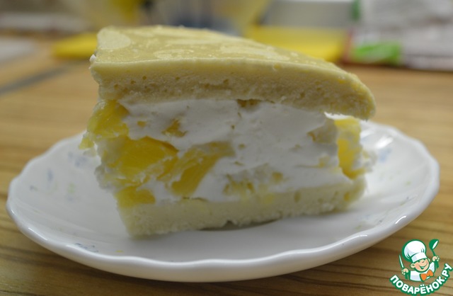 Очень вкусный торт. Делала на 3 яйца. Во время приготовления бисквита у меня случилось ЧП: вылилось часть теста из стакана. Пришлось часть делать заново. По этой причине бисквит опал. В начинку положила меньше пудры. У меня с ананасами, сливками 33% и мягким обезжиренным творогом. И желатин какой-то у меня уж очень сильный. В следующий раз поменьше положу.