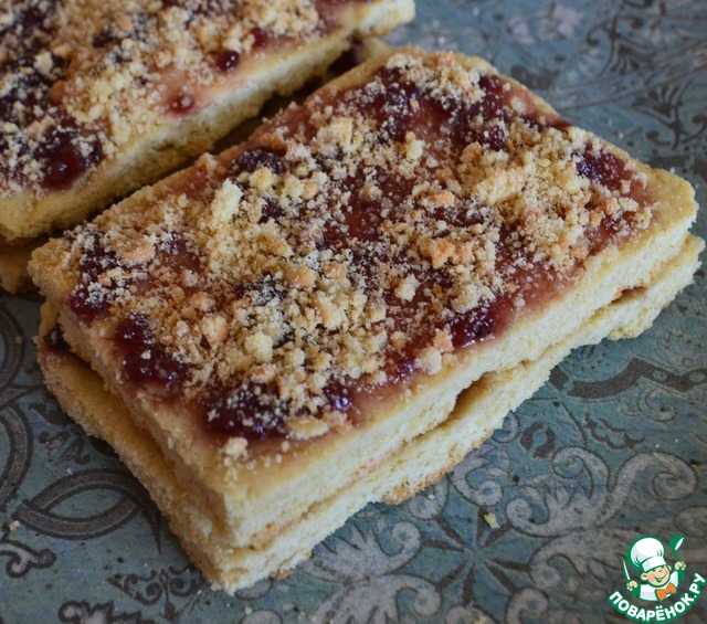 Вкусный пирог! У меня с малиновым вареньем. Сверху посыпала крошкой от теста. Пекла на большом противне и были проблемы с тестом оно буквально разваливалось на куски. Наверно слишком тонко его раскатала. Но вкус это не повлияло, только на внешний вид. Уменьшила количество сахара в тесте. Тесто просто потрясающее рассыпчатое, хрустящее.