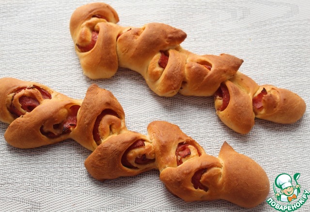 Давно заглядываюсь на рецепт. Но никак не куплю бекон. Сегодня решила приготовить с колбасой. Замес теста доверила ХП. Муки ушло на 3 ст.л. больше. Тесто очень пластичное, обошлась без скалки. Если еще потренироваться, то получится не только вкусно, но и красиво. А пока получилось как-то так. Мои мужчины слопали все сразу. Свежеиспеченные колоски с хрустящей корочкой и нежным мякишем. После остывания уже очень мягко.