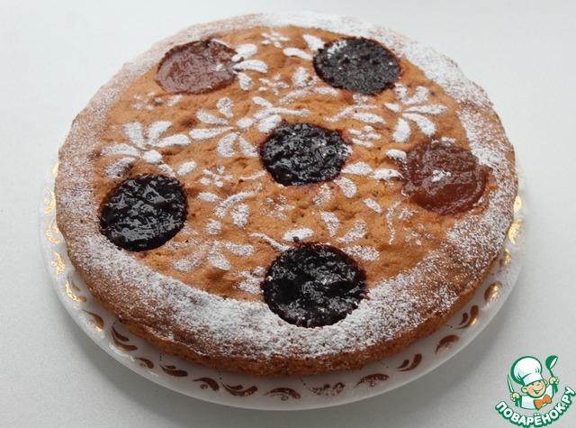 Очень мне понравилась идея оформления пирога, вот и решила воспользоваться. Готовила все точно по рецепту, чуть уменьшив количество сахара. Получилось вкусно и нарядно. Если использовать разноцветные наполнители, получится еще и красочно. У меня два вида яблочного повидла и смородиновое варенье. В следующий раз побольше утоплю формочки в тесте, чтобы начинки было больше.