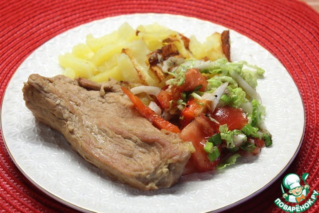 Загорелась и я приготовить мясо. Все делала точно по рецепту. Не совсем поняла, что нужно было делать с имбирем, поэтому порезала вместе с чесноком помельче. Да, мясо получилось очень нежное. Мне не хватило соли, в следующий раз исправлю ситуацию.
