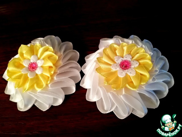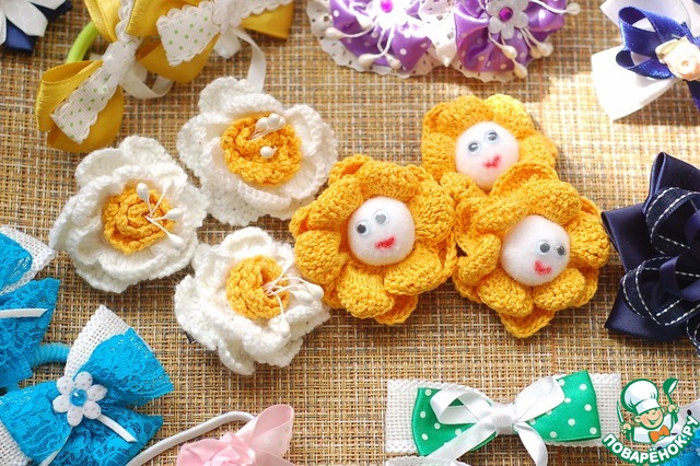 На 3 снимке от низа можно и как брошь сделать . Даже для взрослой красавицы.На первом снимке пара ;когда в 1 класс пошла моя племяшечка ,ей почти такие же с белыми "жемчужинками" прицепили к бантам.До сих пор вспоминаю эти яркие цветочки в белокурых волосиках юной ученицы.