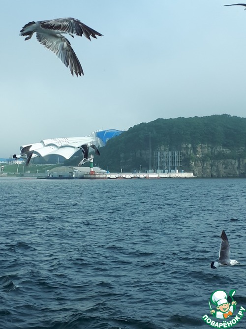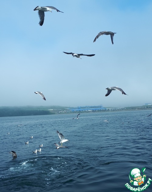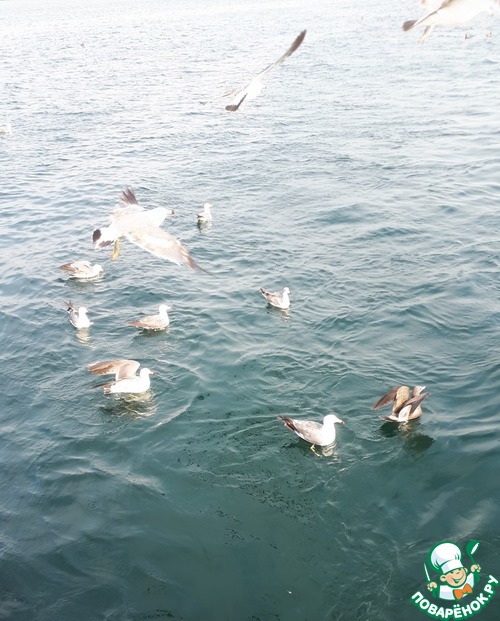 Прожорливые чайки летели за нашим катером и требовали корм,а мы им кидали кусочки хлеба.