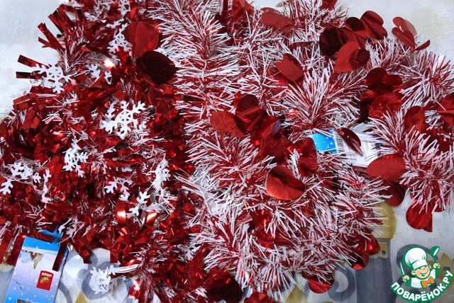 Красивущая мишура, одна со снежинками, вторая с сердечками, как то так получилось, что именно красной мишуры у меня пока не было, теперь есть