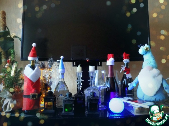Вот такого очаровательного гнома я сделала рост-35 см. Каждой бутылке сотворила шапки!