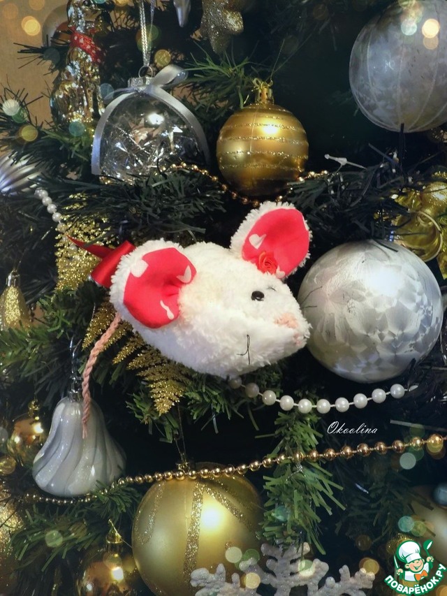 Вот такая очаровашка-белая мышка с яркими ушами и бантами. Размер-15 см. Как украшение ёлки, замечательный подарок на новогодние праздники.